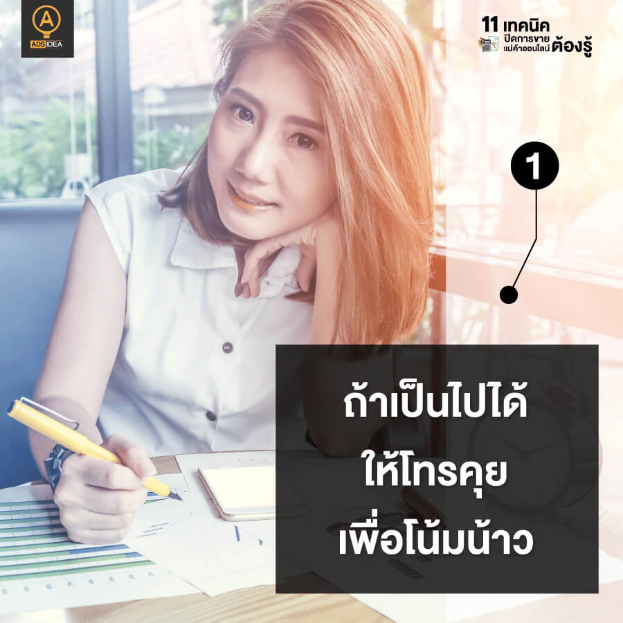 หลาย ๆ ครั้งที่การปิดการขายเกิดจากการโทรคุย หากเราพิมพ์คุยและให้ข้อมูลกับลูกค้าครบถ้วนแล้วลูกค้าก็ยังลังเล อาจเกิดจากความไม่มั่นใจ เพราะการสื่อสารผ่านตัวอักษรขาดบางอย่างที่สำคัญไป คือ “น้ำเสียง” และ “อารมณ์”ลองดูครับ เข้าใจว่าแม่ค้าหลาย ๆ คนไม่ชอบโทรคุยเพราะมันวุ่นวายจุกจิก แต่ฝึกทักษะนี้ไว้ครับมันจะทำให้คุณปิดการขายได้ง่ายขึ้น