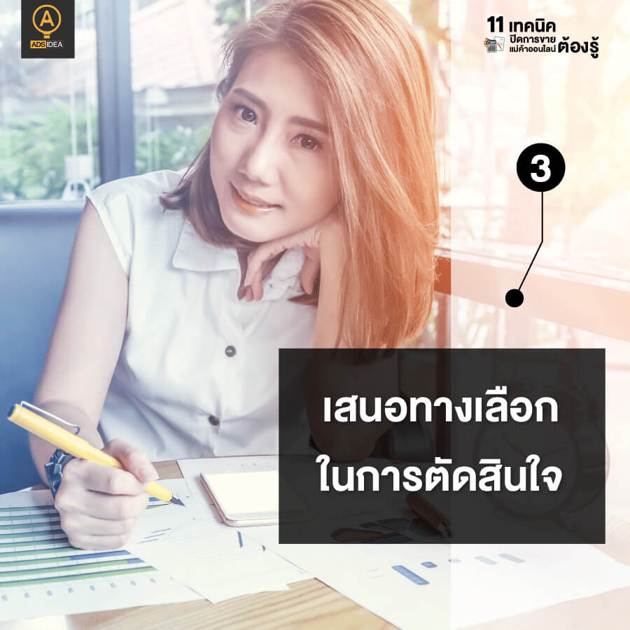 การเสนอทางเลือกมาก ๆ ให้ลูกค้า บางทีลูกค้าจะเกิดอาการ “ลังเล” คือตัดสินใจไม่ถูกเพราะมีทางเลือกมากเกินไป เราในฐานะนักขาย เลือกให้เค้ามาเลยครับที่เราวิเคราะห์แล้วว่าเหมาะกับลูกค้า เอาแค่ 2-3 ตัวเลือก และชี้แจงถึงผลประโยชน์ของตัวสินค้านั้นๆ ผลประโยชน์ที่ลูกค้าจะได้ให้ชัดเจน