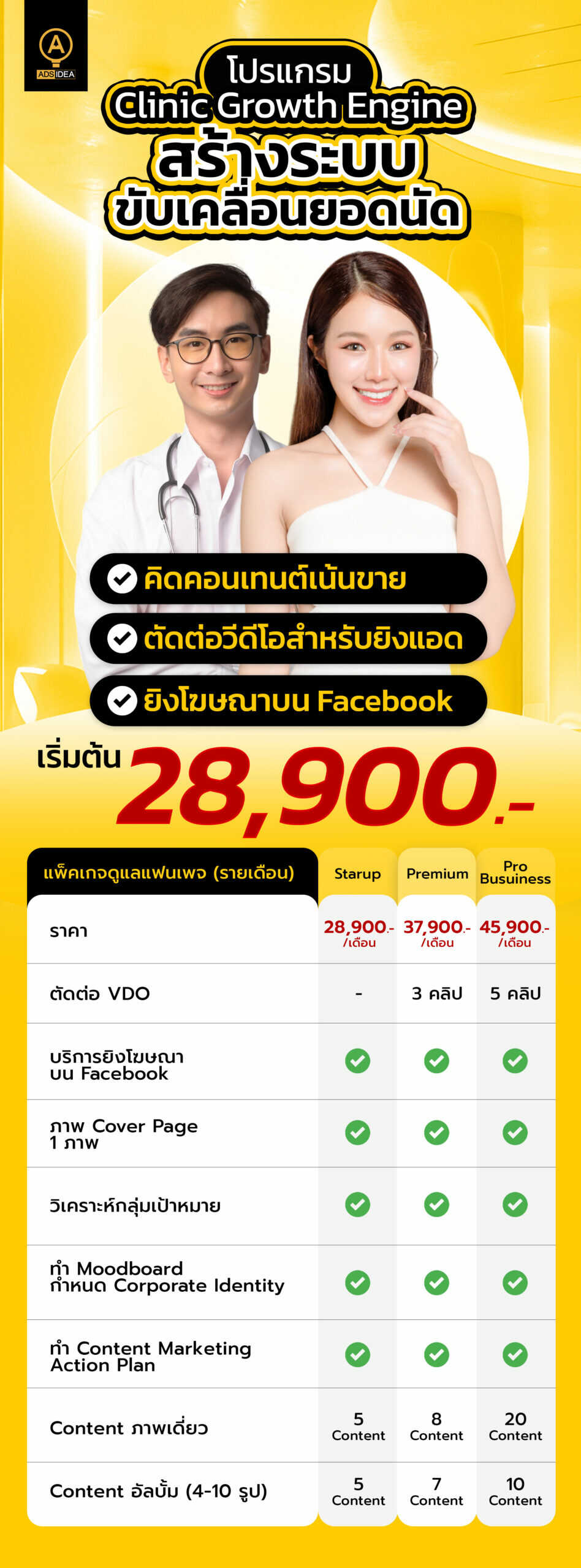 “สวัสดีครับ ADSIDEA ต้องขอบคุณที่สนใจแพ็กเกจ ‘Clinic Growth Engine’ นะครับ จากที่เราดูแลธุรกิจคลินิก มาจำนวนมาก ต้องบอกเลยว่าแข่งขันหนักมาก และมากกว่าเดิมหลายเท่า คลินิกใหม่มากขึ้น คลินิกเก่าก็แข็งแกร่ง แล้วแต่ละคลินิกโหมการตลาดหนักมาก