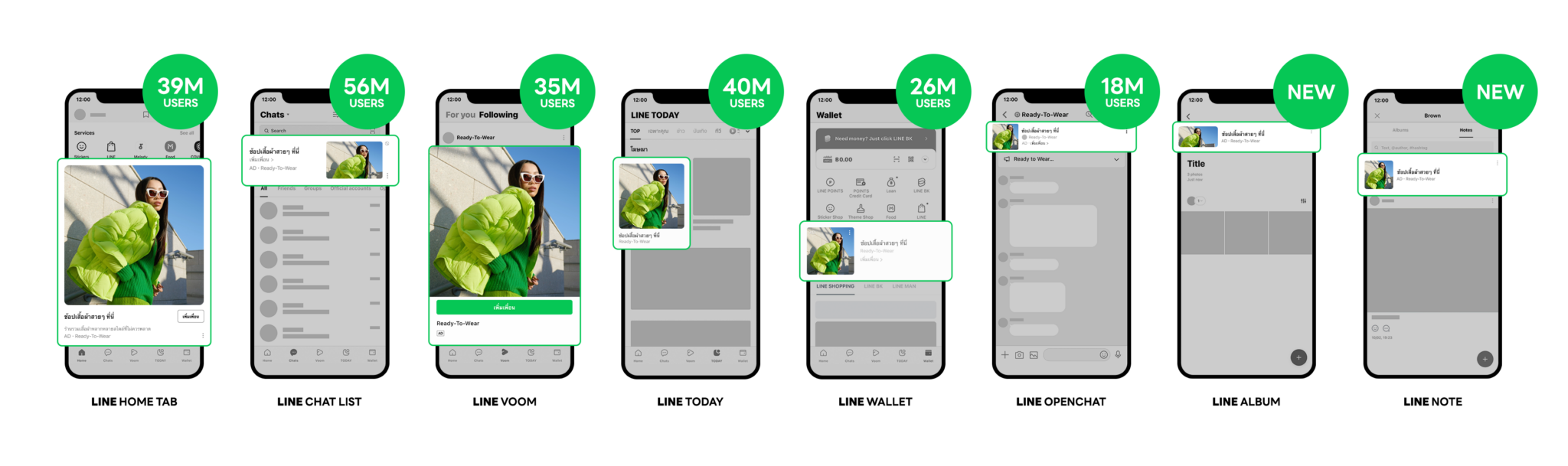 โดยตัวโฆษณาจะแสดงบนตำแหน่งต่างๆ ของแอปฯ LINE ไม่ว่าจะเป็น Home Tab หน้าช่องแชต (Chat List) LINE VOOM LINE Today Wallet Tab รวมถึง LINE Openchat